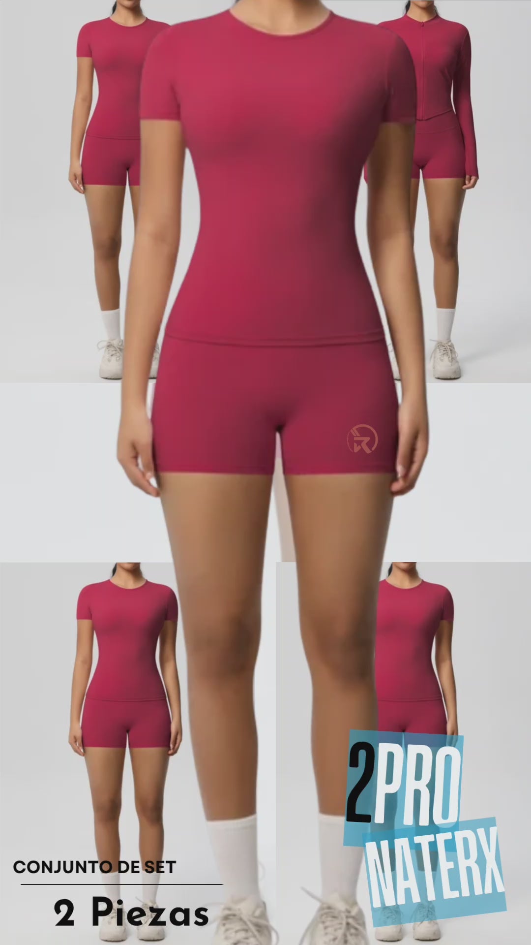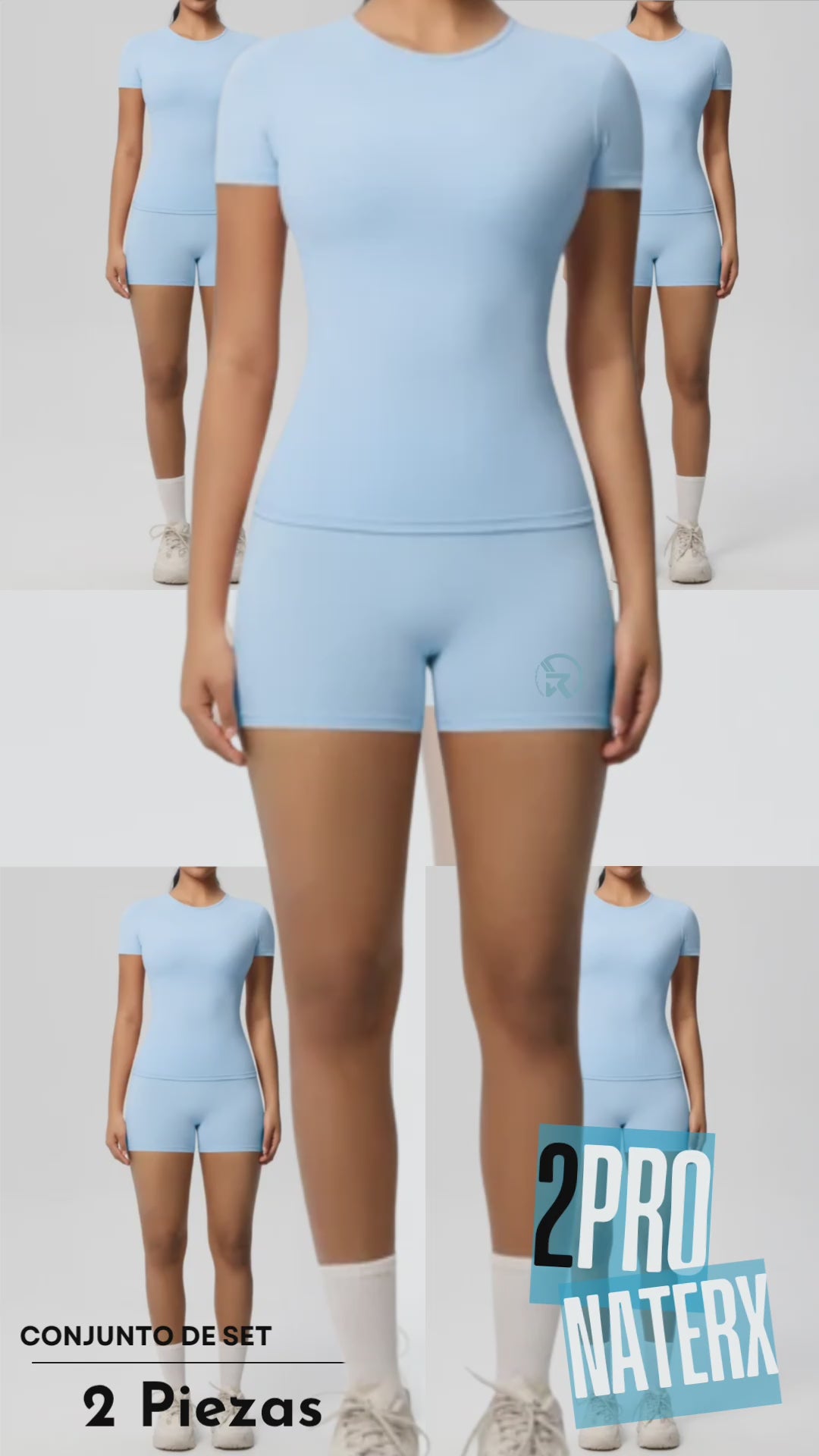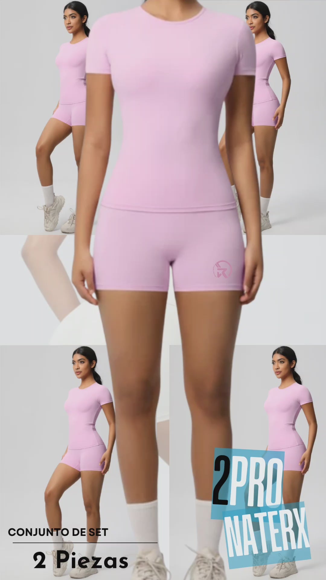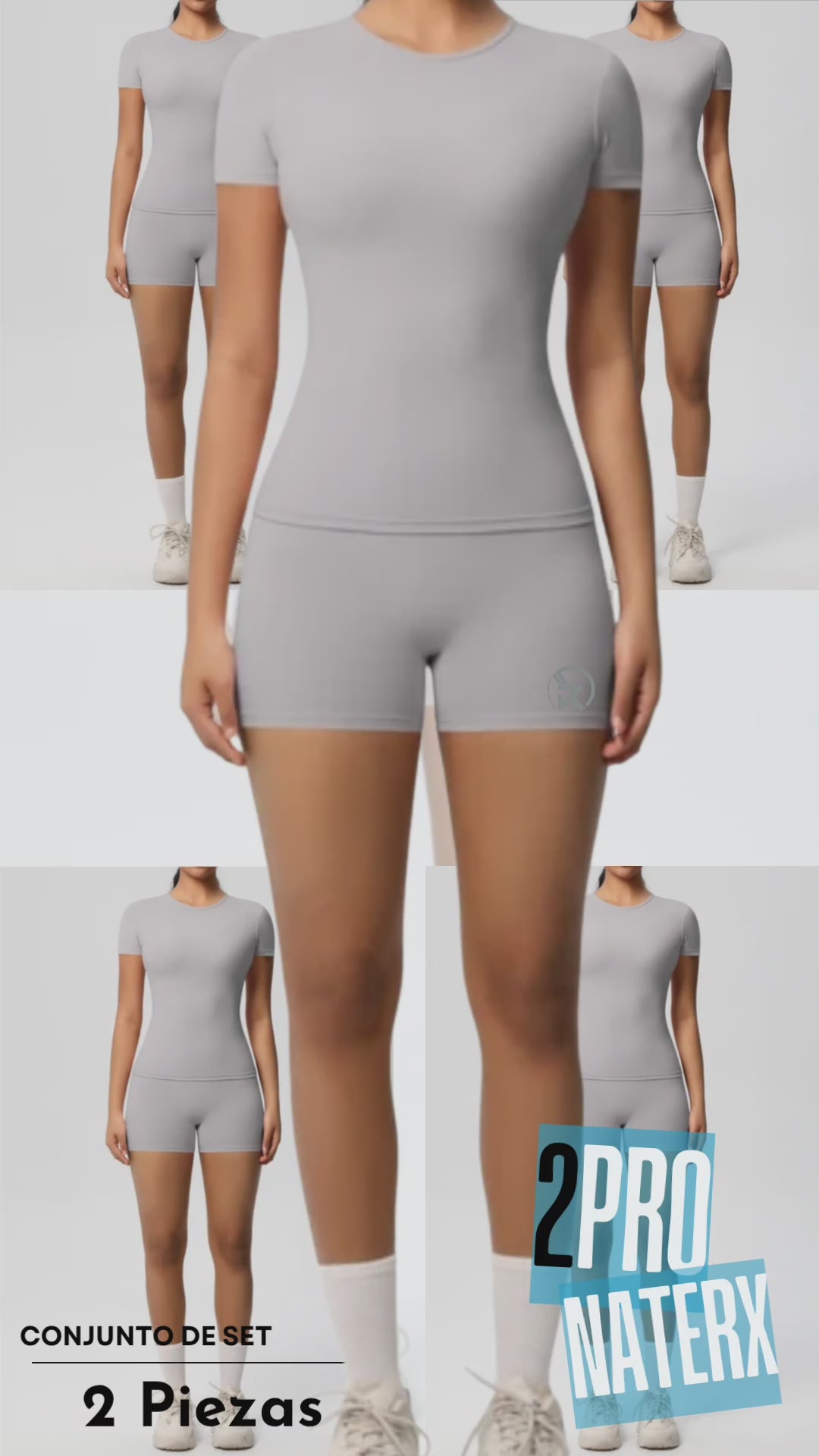 Este conjunto deportivo está diseñado para ofrecer un ajuste preciso que realza la figura sin limitar el movimiento. Su camiseta de manga corta, de corte anatómico, se adapta al cuerpo brindando comodidad, frescura y soporte ligero, mientras que el short de tiro medio proporciona seguridad y libertad durante el entrenamiento.
